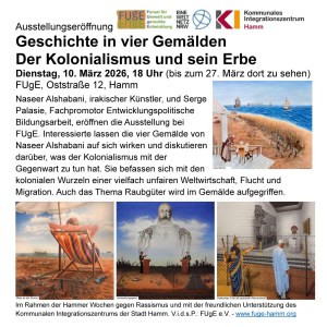 In den Räumlichkeiten von FUgE Hamm betrachten wir vier von Naseer Alshabani umgesetzte Gemälde und diskutieren darüber, was der Kolonialismus mit der Gegenwart zu tun hat. Mit Naseer Alshabani und Serge Palasie, Fachpromotor Entwicklungspolitische Bildungsarbeit Fokus Afrika beim Eine Welt Netz NRW wird die Ausstellung eröffnet.