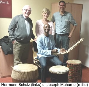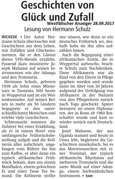 Auf Initiative der VHS Werl und FUgE Hamm präsentiert der Buchautor Hermann Schulz ab 19 Uhr im Bürgerhaus Wickede (Kirchstr. 4) Ausschnitte aus seinen Werken. Musikalisch wird Schulz von Joseph Mahame begleitet, der passend zu den Geschichten die Vielfalt seines Repertoires der Perkussion Ugandas zeigt.