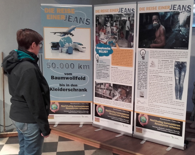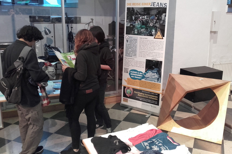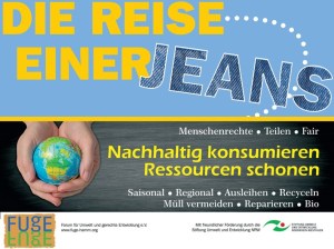Bei der Kleidertauschparty zeigt FUgE seine Ausstellung „Die Reise einer Jeans“, die im Rahmen seines Projektes „Nachhaltig konsumieren – Ressourcen schonen“ entwickelt wurde und von der Stiftung Umwelt und Entwicklung gefördert wird.
