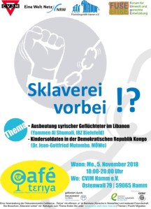 Yammen Al Shumali, IBZ Bielefeld, referiert über die Ausbeutung syrischer Geflüchteter im Libanon und Dr. Jean-Gottfried Mutombo, MÖWe Dortmund, über die Kindersoldaten in der Demokratischen Republik Kongo. Sie zeigen auf, dass Sklaverei und andere Formen struktureller Ausbeutung weiterhin aktuell sind.