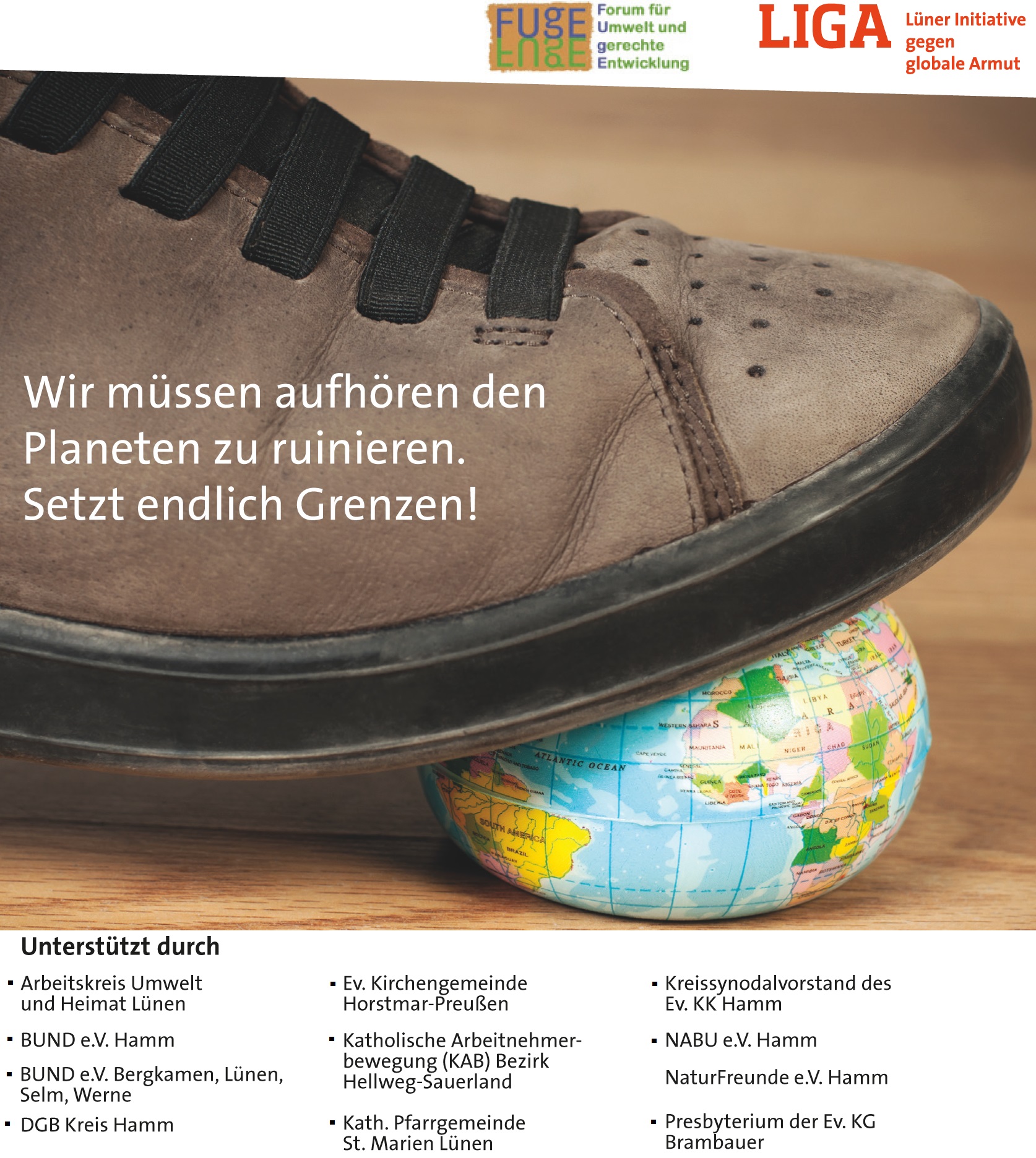 Die Netzwerke FUgE Hamm (Forum für Umwelt und gerechte Entwicklung e.V.) und LIGA Lünen (Lüner Initiativ gegen globale Armut e.V.) gemeinsam mit einem regionalen Unterstützerkreis von kirchlichen Organisationen, Gewerkschaften sowie Natur- und Umweltschutzverbänden stellen im Pressegespräch am Mittwoch, 14. November 2018 im FUgE-Weltladen den Lippe-Aufruf für eine mutige Politik „Wir müssen aufhören den Planeten zu ruinieren. Setzt endlich Grenzen!“ vor.