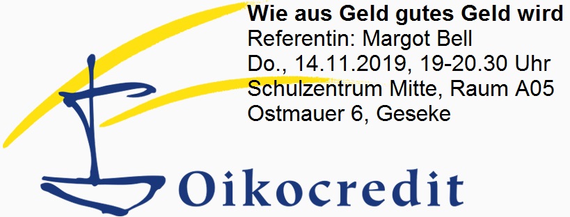 Im Rahmen ihres Vortrags für sozial interessierte Menschen stellt die Referentin Möglichkeiten wie z.B. die Oikocredit-Förderkreise vor, um mit seiner Geldanlage global eine sozial gerechte und nachhaltige Entwicklung zu fördern.