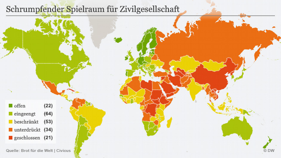 Man benutzt den Begriff Shrinking Spaces, um die eingeschränkten Handlungsspielräume der Zivilgesellschaft zu kennzeichnen, die in einem Widerstand gegen die Auflösung demokratischer Strukturen steht. Das geht einher mit dem Vormarsch populistischer und rechtsextremer Parteien und Regierungen.