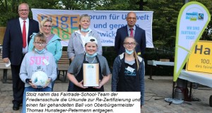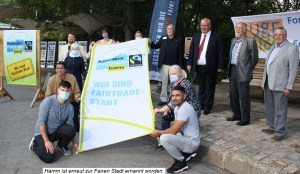 Um 13 Uhr war es amtlich: Hamm bleibt Stadt des Fairen Handels. Markus Heißler, (Sprecher der Fairen Metropole Ruhr) überreichte Oberbürgermeister Thomas Hunsteger-Petermann und Aktiven des Fairen Handels in der Stadt die Urkunde für die Stadt. Im Anschluss überreicht Hunsteger-Petermann eine Urkunde an Vertreter der Friedensschule, die ebenfalls ihren Titel als Fairtrade School erneuert bekamen. Michael Kunze begleitete diesen kleinen Festakt stimmungsvoll am Saxofon. Aber auch an den Ständen wurde der faire Handel großgeschrieben. So präsentierten sich die Friedensschule und die Marienschule als Fairtrade Schulen und der Weltladen bot Schönes und Praktisches aus dem Fairen Handel an. Erstmals dabei war auch ein Stand der Fairen Metropole Ruhr.