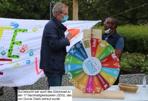 Mitmach-Aktionen wie dem SDG-Glücksrad, Torwandschießen (und Informationen über Faire Bälle), Papierschöpfen, Steine bemalen, Baumklettern oder der Fahrrad-Parcours des ADFC lockten zahlreiche Besucher an. Begeistert zeigten sich die Besucher auch den Klängen von Sambanda Girassol – auch wenn naturgemäß kaum möglich war, in dieser Zeit sich am Stand zu unterhalten und den Künsten vom Zauberer Ludgero, der kleine und große Zuschauer in seinen Bann zog. Zwischendrin blieb auch genügend Raum für einen konstruktiven Austausch oder auch nur zum Klönen bei einer Tasse fairem Kaffee.
