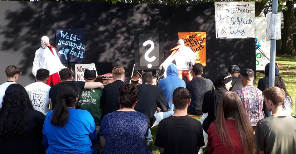 Das Straßentheaterensemble „Schluck & weg“ der BUKO Pharma-Kampagne schafft einen Raum, in dem die drastische Verschlechterung der Gesundheitsversorgung und Lebensbedingungen von Frauen, Müttern und Kindern auf verschiedenen Ebenen thematisiert wird Die Aufführu ng ist gespickt mit schrägen Szenen und bitterbösen Pointen, entstand en auf Grundlage einer literatur und interviewbasierten Länderstudie der Pharma Kampagne zu den Folgen der Corona Pandemie in Südafrika, Peru, Ghana und Deutschland.