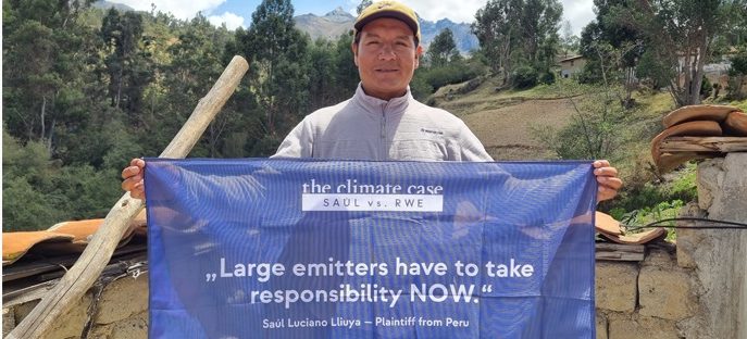 Saúl hat sich entschlossen, Initiative zu ergreifen. Im November 2015 hat er eine Klimaklage gegen RWE eingereicht. Als einer der größten CO2-Emittenten Europas ist RWE für rund ein halbes Prozent der weltweiten Treibhausgasemissionen verantwortlich. Der Energieriese trägt also zur Gletscherschmelze in den Anden und somit dem Flutrisiko in Huaraz bei. Deshalb fordert Saúl in seiner Klage, dass sich RWE an den Kosten für einen Schutz – damm beteiligt – umgerechnet mit 20.000 US-Dollar, gemäß dem Anteil RWEs an der Klimakrise. Er beruft sich dabei auf § 1004 des deutschen Bürgerlichen Gesetzbuchs, den sogenannten Nachbarschaftsparagrafen. Es handelt sich bei der Klage also um einen globalen Nachbarschaftsstreit. Den beklagten Konzern und den Kläger trennen zwar rund 10.000 Kilometer. Aber über die weiterhin hohen CO2-Emissionen des Essener Unternehmens, deren globale Folgeschäden auch Menschen in Peru betreffen, sind sie miteinander verbunden. „RWE muss Verantwortung übernehmen“, fordert der Bergführer. „Wir in Peru haben kaum etwas zum Klimawandel beigetragen, leben aber mit den schlimmsten Konsequenzen.“