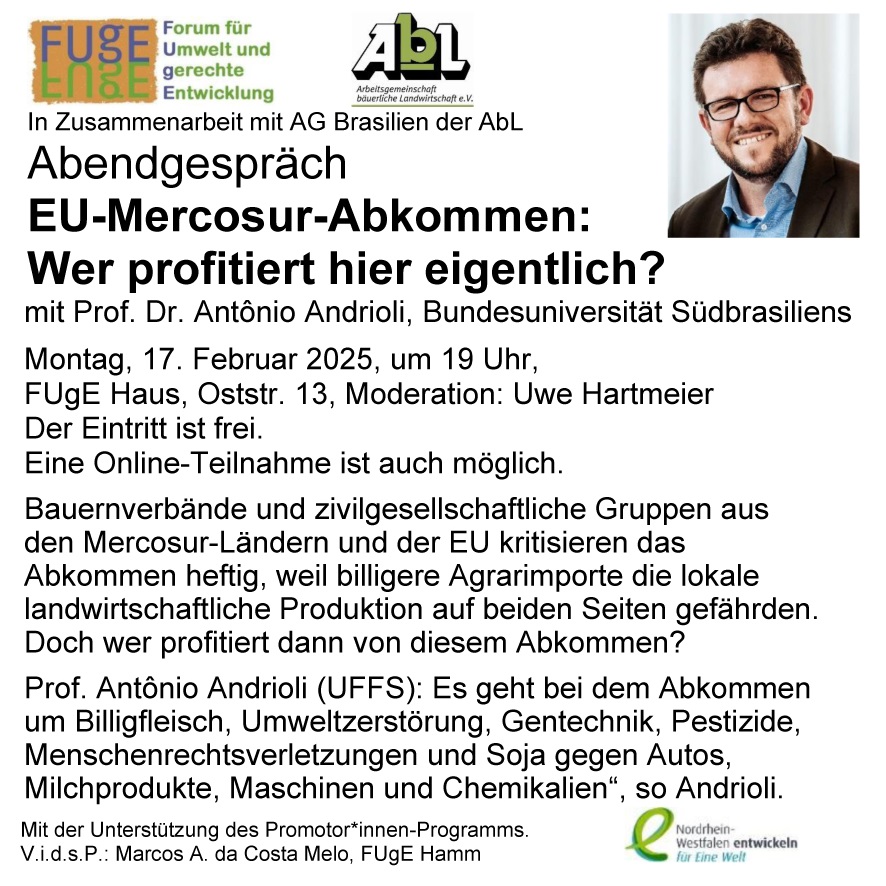 Auf Initiative der Brasiliengruppe der AbL (Arbeitsgemeinschaft bäuerlicher Landwirtschaft) und FUgE geht Prof. Antônio Andrioli von der Bundesuniversität Südbrasilien am 17. Februar ab 19 Uhr im FUgE Haus dieser Frage nach. Der Agrarwissenschaftler und Soziologe aus Brasilien referiert dabei auch über die Wege zur Überwindung der zerstörerischen Lebensmittelversorgung und die Bedeutung der Agrarreform sowie der ökologischen Landwirtschaft in Lateinamerika. Aus seiner Sicht sollten wir alarmiert sein. „Es geht bei dem Abkommen um Billigfleisch und Ethanol, Umweltzerstörung und Menschenrechtsverletzungen, Gentechnik und Pestizide, Rindfleisch und Soja gegen Autos, Milchprodukte, Maschinen und Chemikalien“, so Prof. Andrioli.
