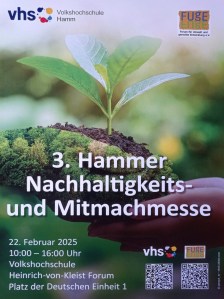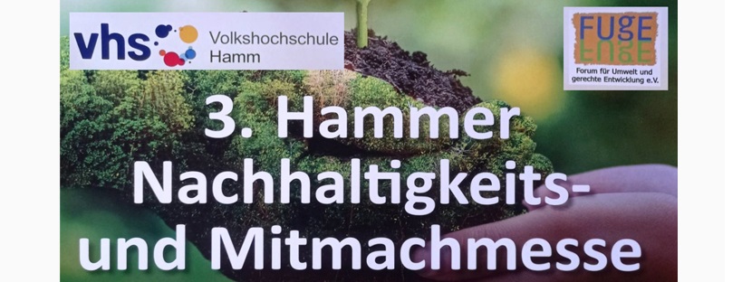 Organisiert vom Forum für Umwelt und gerechte Entwicklung (FUgE) und der Volkshochschule Hamm (VHS Hamm) präsentieren am 22. Februar 2025 zwischen 10 und 16 Uhr rund 30 Aussteller im Gerd-Bucerius-Saal und den Seminarräumen in der VHS ihre Ideen für mehr Nachhaltigkeit im Alltag. Mit Bildungsangeboten in Form von Workshops und Vorträgen wird das Gesamtpaket der dritten Hammer Nachhaltigkeits- und Mitmach-Messe abgerundet. Für das Workshop- und Vortragsprogramm konnten einige Namhafte Referenten gewonnen werden. Alle Veranstaltungen finden in den Räumlichkeiten der VHS statt.