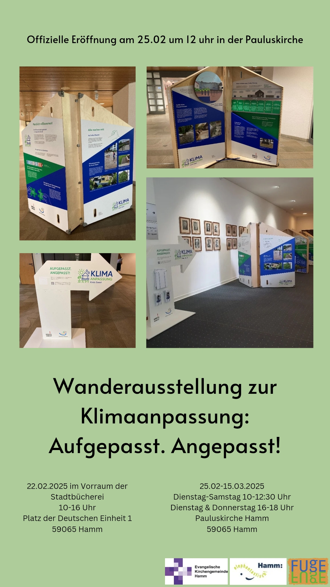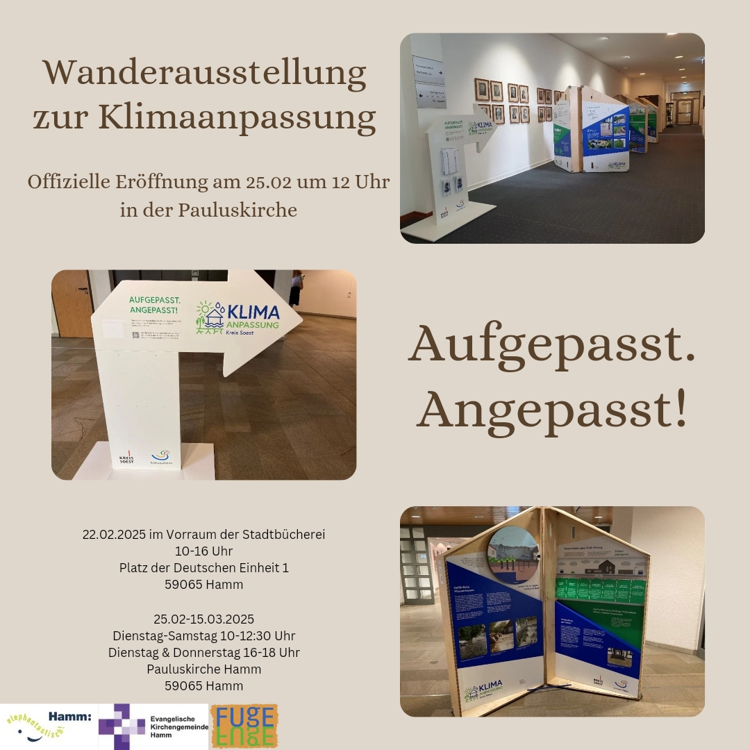 Die Stadtkirchenarbeit an der Pauluskirche, das Klimaschutzmanagement der Stadt Hamm und FUgE e.V. zeigen die vom Kreis Soest entwickelte Ausstellung „Aufgepasst. Angepasst“ zwischen dem 25. Februar und dem 15. März 2025 in der Pauluskirche Hamm. Bei der Eröffnung sprechen Oberbürgermeister Marc Herter und Klimaschutzmanager Tobias Garske sowie die Akteurinnen des Kirchenkreises Hamm und dem FUgE e.V..