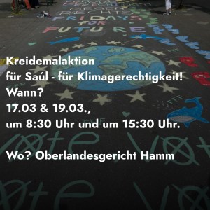 Um auf die Notwendigkeit der Klimagerechtigkeit Nachdruck zu verleihen beteiligt sich Friday For Future Hamm ab 8.30 Uhr mit zahlreichen Aktionen an der Klimaklage u.a. mit Kreideaktionen und einer Mahnwache.