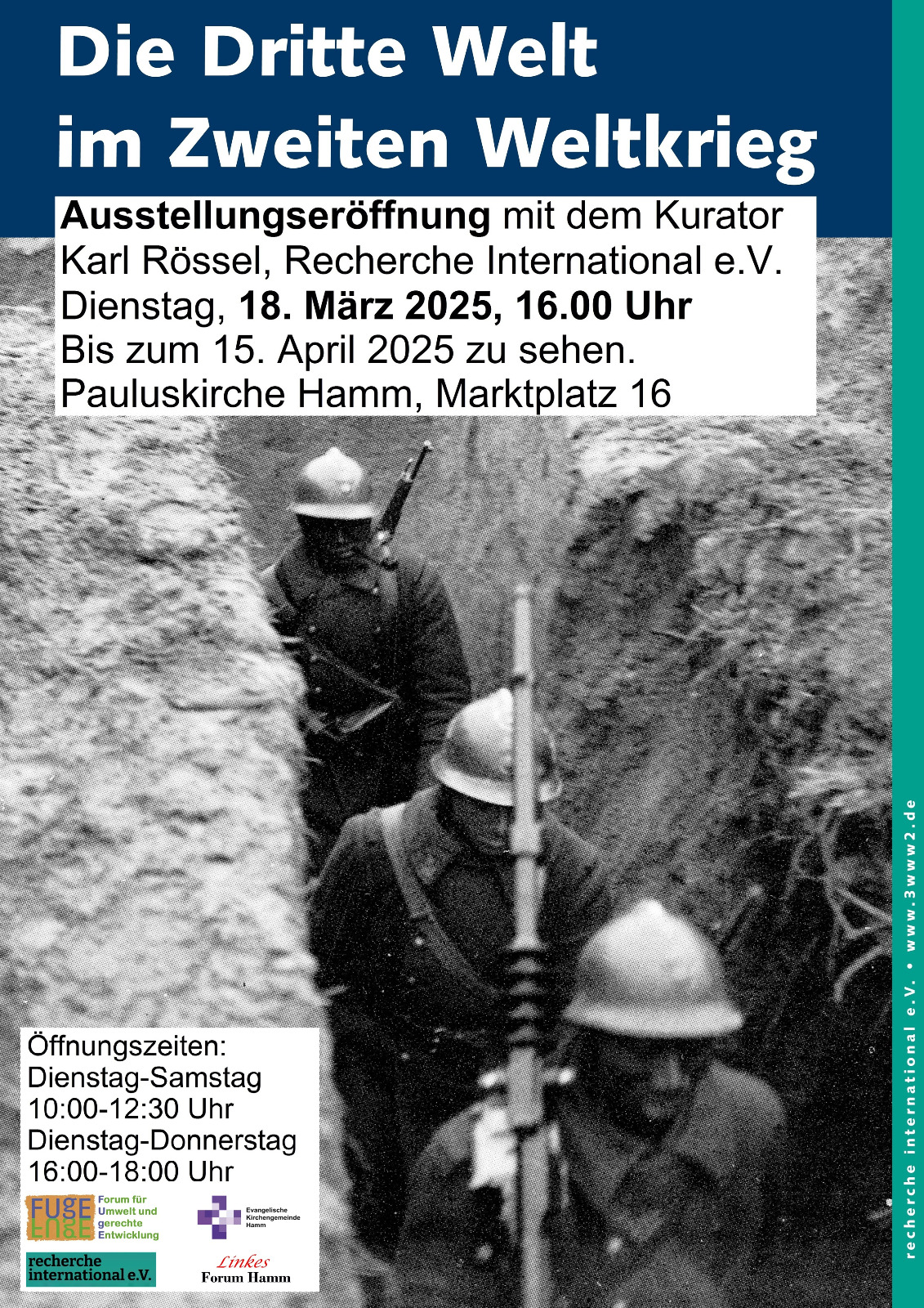 Nach der Begrüßung der Pfarrerin Astrid Taudien und OB Marc Herter wird die Ausstellung durch den Kurator Karl Rössel eröffnet. Über 65 Bildtafeln, Texte und Landkarten, die auf Grundlage zahlreicher Interviews mit Veteranen, Zeitzeuginnen und Historikerinnen in 30 Ländern entstanden, behandeln ein vergessenes Kapitel der Geschichte. Es waren Millionen Kolonialsoldaten aus Afrika, Asien und Ozeanien, die im 2. Weltkrieg Militär- und Arbeitsdienste für die Kolonialmächte freiwillig oder zwangsrekrutiert leisteten. Sie befreiten die Welt vom deutschen und italienischen Faschismus bzw. vom japanischen Großmachtwahn. Gleichzeitig wurden weite Teile der kolonialisierten Welt zu Schlachtfeldern und dienten als Zulieferer für kriegswichtige Rohstoffe und Nahrungsmittel.