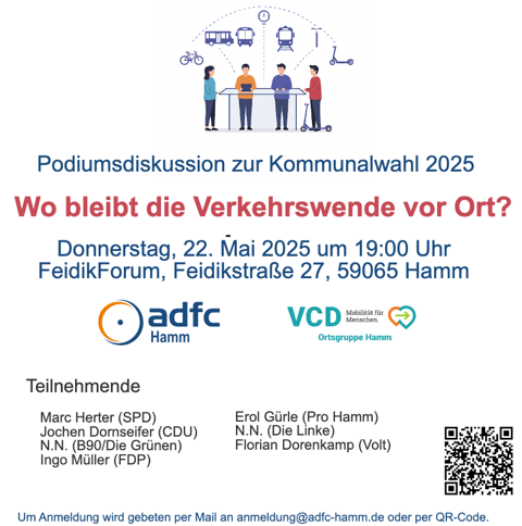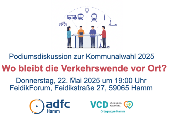 Am 22. Mai 2025 veranstalten der ADFC Hamm und die VCD-Ortsgruppe Hamm gemeinsam eine Podiumsdiskussion zur anstehenden Kommunalwahl unter dem Titel „Wo bleibt die Verkehrswende vor Ort?“.