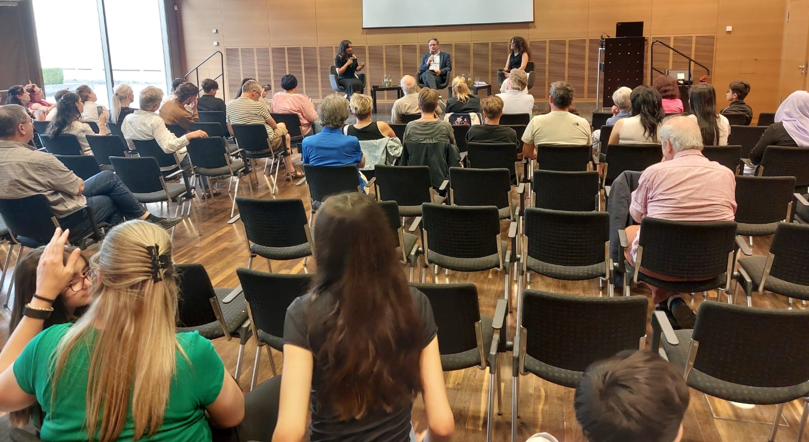 Jihan Alomar las Passagen aus ihrem Buch „Dankbarkeit“, in dem sie ihre Erlebnisse als zehnjähriges Mädchen beschreibt, das die Gewalttaten des sogenannten Islamischen Staates im Nordirak überlebt hat. Die Zuhörerinnen und Zuhörer folgten ihren Worten in gespannter Stille. Trotz der Schwere des Themas sprach Alomar mit ruhiger Klarheit – eine Haltung, die viele Anwesende sichtlich berührte.
