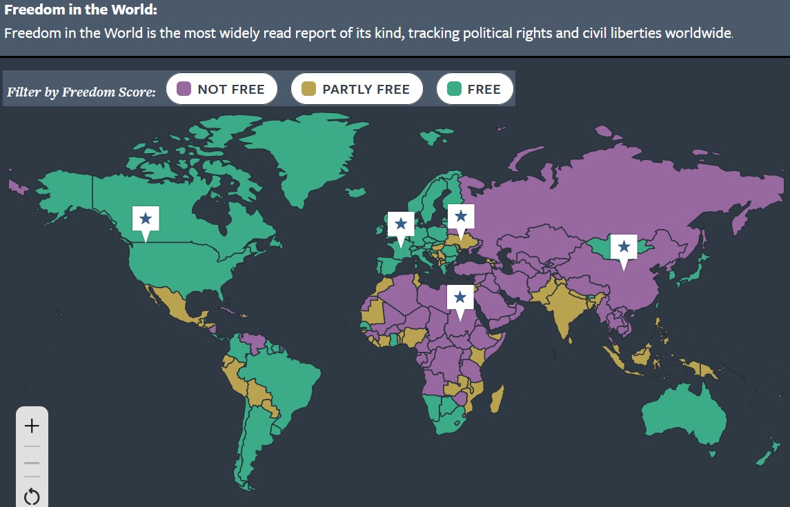 Explore the interactive Freedom in the World 2025 map, where you can see country scores, Freedom Status, and trends.