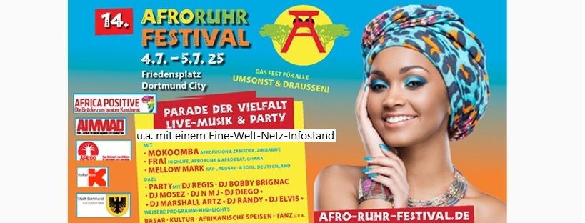 Auf Initiative von Eine Welt Netz NRW, DARF Bochum, FUgE Hamm und Welthaus Dortmund findet am Freitag, 4. Juli, ab 15 Uhr, und am Samstag, 5. Juli, ab 10 Uhr, auf den Friedensplatz Dortmund Eine-Welt-Infostand mit Mitmachaktionen im Rahmen des Afro-Ruhr-Festivals, www.afroruhr.africa-positive.de, statt.