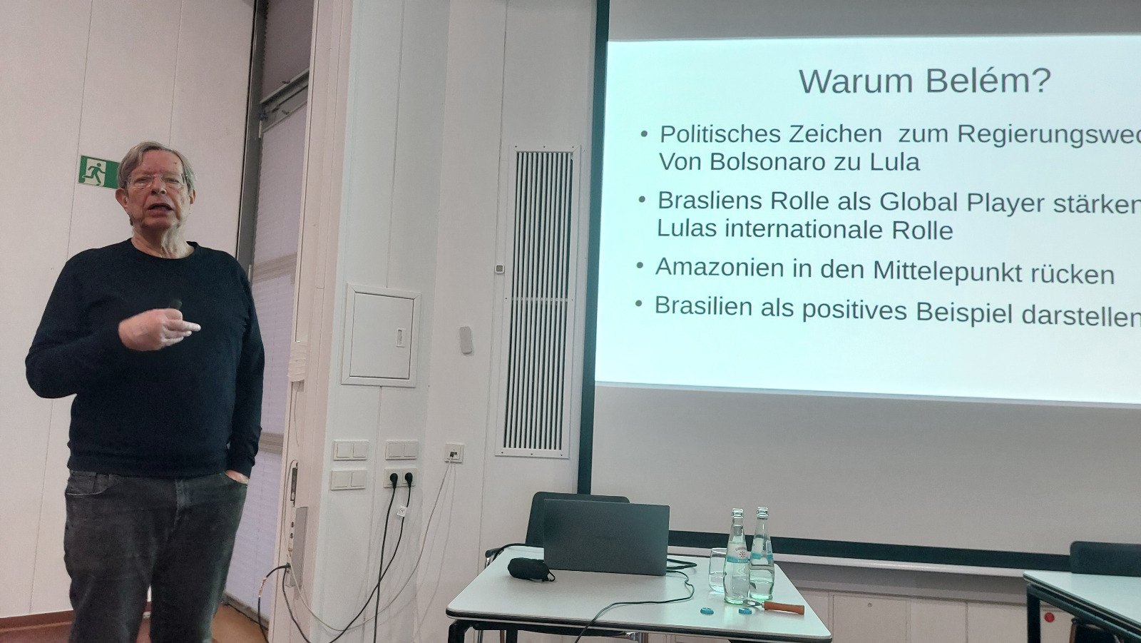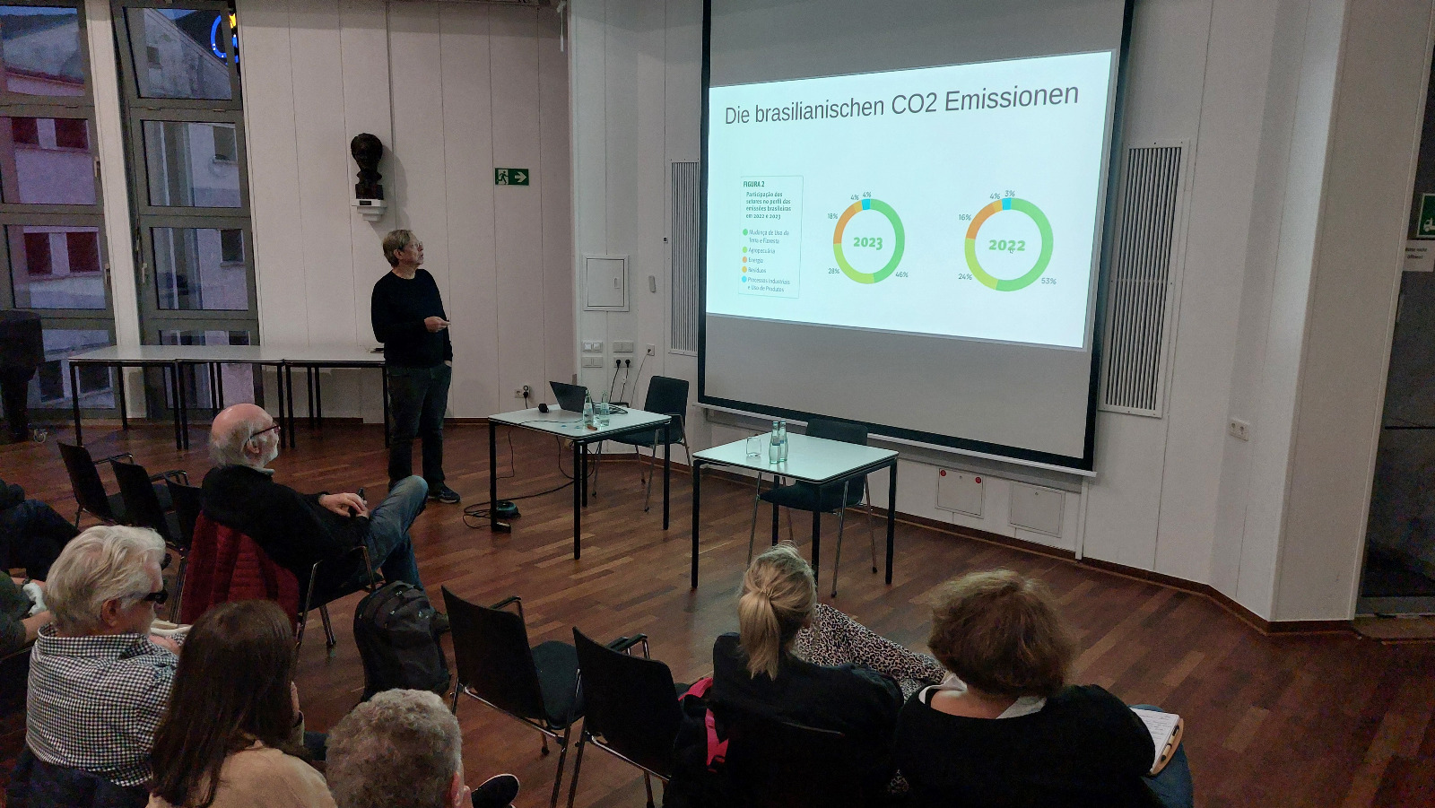 Um die 20 Leute kamen zum Vortrag des Tropenwaldschutz-Experten Dr. Thomas Fatheuer am 1. Oktober 2025 in die Auslandsgesellschaft. Der Referent blickte positiv auf die Weltklimakonferenz (COP30) in Belém/Brasiliens, da sie wieder in einem demokratischen Land stattfinden soll. Zudem ist die brasilianische Regierung ein zuverlässiger Verteidiger des Multilateralismus und des UN-Systems. Die Wahl des Ortes Belém hat für ihn einen hohen symbolischen Wert. Vor allem die Zerstörung des Regenwaldes ist ein wichtiger Faktor bei der CO2-Emission.