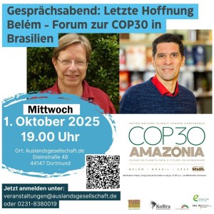Vom 10. bis 21. November 2025 findet die Weltklimakonferenz (COP30) in der Zwei-Millionenstadt Belém (Amazonasregion Brasiliens) statt. Die letzten COPs, COP28 in Dubai/Emirats und COP29 in Baku/Aserbaidschan waren enttäuschend und so sind die Erwartungen an die diesjährige COP groß. Endlich findet die Konferenz wieder in einem demokratischen Land statt. Zudem ist die brasilianische Regierung ein zuverlässiger Verteidiger des Multilateralismus und des UN-Systems. Die Wahl des Ortes Belém hat einen hohen symbolischen Wert. Vor allem die Zerstörung des Regenwaldes ist ein wichtiger Faktor der CO2-Emissionen, Lösungen werden hier dringend benötigt und sind möglich.
