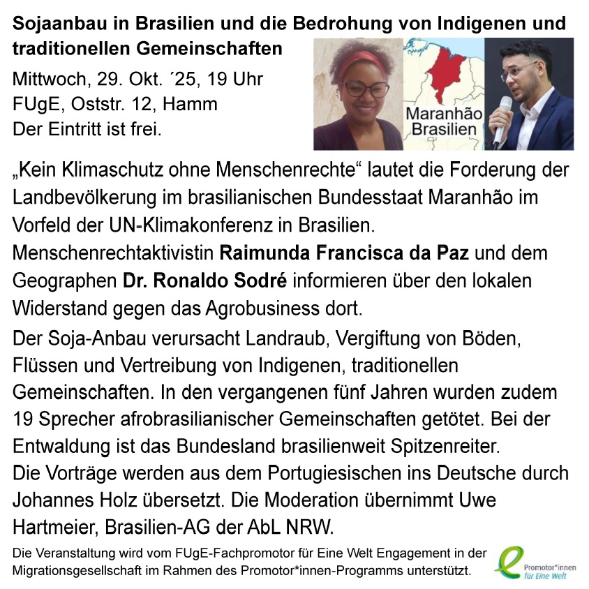 „Kein Klimaschutz ohne Menschenrechte“ lautet die Forderung der Landbevölkerung im brasilianischen Bundesstaat Maranhão. Auf Einladung von FUgE (Forum für Umwelt und gerechte Entwicklung) und der Brasilien-AG der AbL NRW (Arbeitsgemeinschaft bäuerlicher Gemeinschaft) können Interessierte am 29. Oktober 2025 um 19 Uhr in der Oststraße 12 in Hamm mit der Menschenrechtaktivistin Raimunda Francisca da Paz und dem Geographen Dr. Ronaldo Sodré ins Gespräch kommen. Die beiden informieren im Vorfeld der UN-Klimakonferenz COP30 über den Widerstand von Indigenen und traditionellen Gemeinschaften gegen das Agrobusiness im Nordosten Brasiliens.