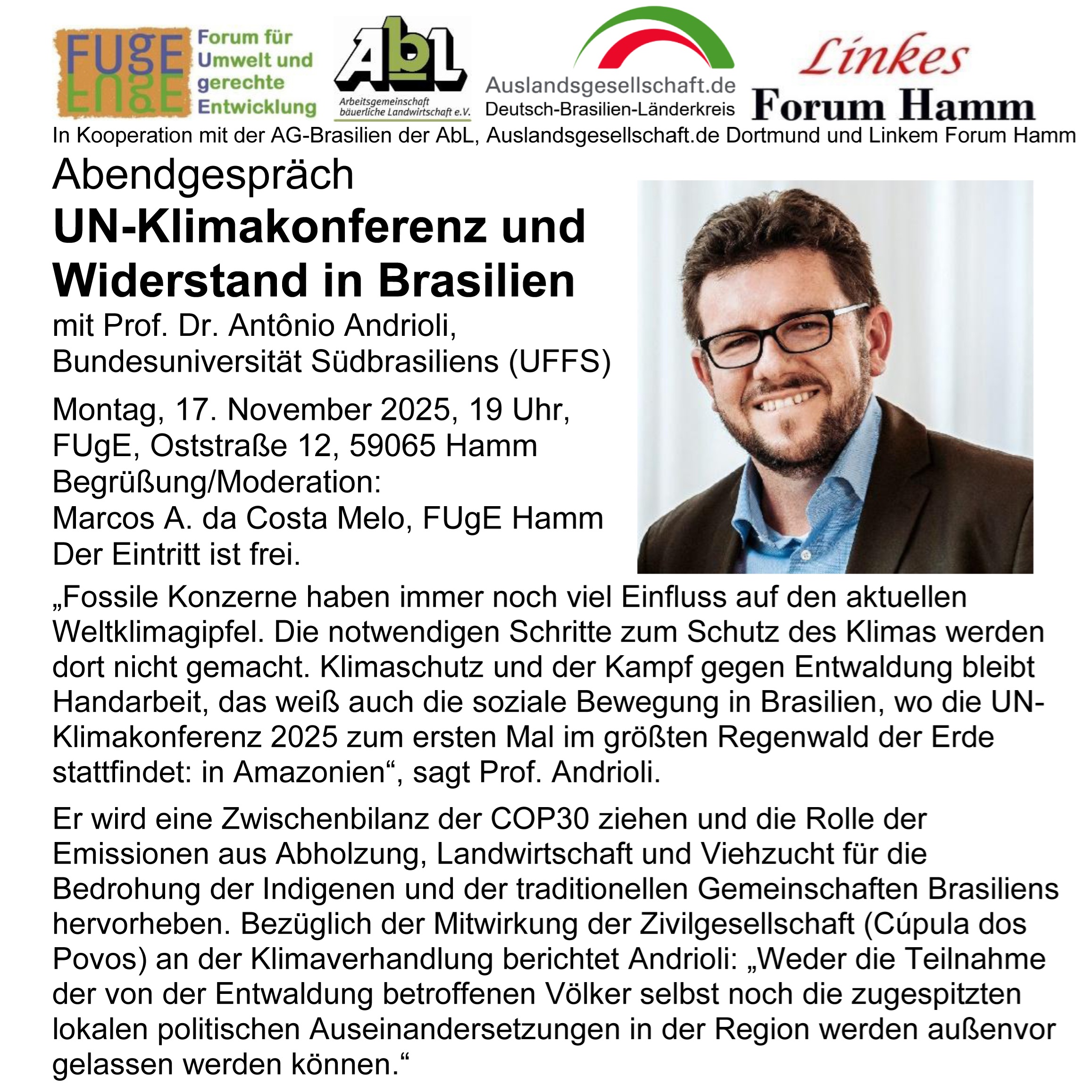 Die AG-Brasilien der AbL, die Auslandsgesellschaft Dortmund, das Linke Forum und FUgE Hamm laden zum Abendgespräch „UN-Klimakonferenz und Widerstand in Brasilien“ mit Prof. Antônio Andrioli von der Bundesuniversität Südbrasilien ein, das am Montag, 17. November 2025, um 19 Uhr, in der Oststraße 12 stattfindet.