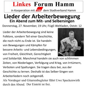 Im Mittelpunkt des Abends stehen Lieder aus der Tradition der Arbeiter-bewegung, der Freiheits- und Fortschrittskämpfe, aus dem antifaschistischen Widerstand und den neuen sozialen Bewegungen. Dazu gehört auch Liedgut, das wohl nicht im eigentlichen Sinne politisch links ist, aber vom Lebensgefühl her passt.