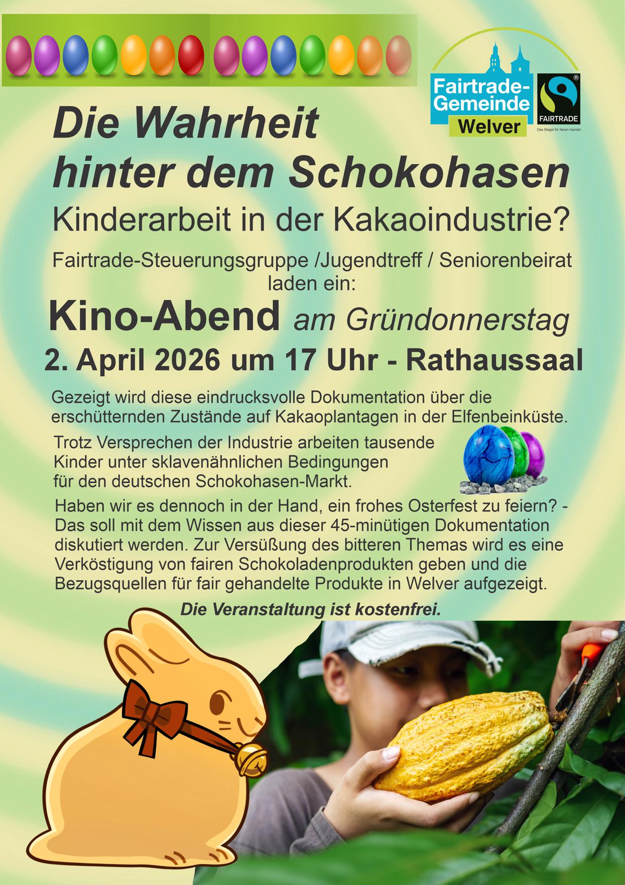 Zur Versüßung des bitteren Themas wird es eine Verköstigung von fairen Schokoladenprodukten geben und die Bezugsquellen für fair gehandelte Produkte in Welver aufgezeigt.
