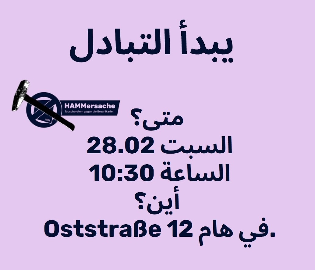 Die Initiative „Hammersache Tauschsystem gegen die Bezahlkarte“ lädt gemeinsam mit FUgE und der Flüchtlingshilfe Hamm zur Kaffeerunde am Samstag, 27. Juni 2026, um 10.30 Uhr bis 13.00 Uhr in die Oststraße 12 Hamm ein.