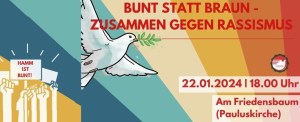 22.01.2024: Demo „Bunt statt Braun – Zusammen gegen Rassismus“ – Paluskirche Hamm - Mit der Unterstützung eines breiten Bündnisses von demokratischen Parteien, Rundem Tisch gegen Radikalismus und Gewalt, ver.di, sowie von zahlreichen Vereinen.