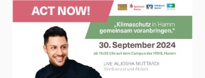 30.09.2024: ACT NOW! Klimaschutz in Hamm gemeinsam voranbringen - Mit Aljosha Muttardi als Impulsgeber, der auf der Klimaschutzbühne eine Keynote zum Thema „Klimaschutz und Ernährung“ halten wird.