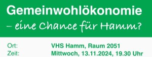 13.11.2024: Gemeinwohlökonomie – eine Chance für Hamm? - Die Beiträge richten sich an alle, die ihr Wissen über die GWÖ in der Umgebung vertiefen möchten.