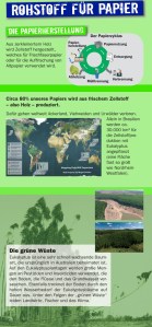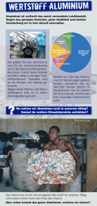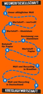 Auf den folgenden Bannern veranschaulichen wir an den Beispielen Aluminium und Papier, wie wir diese Rohstoffe alltäglich nutzen und welche Folgen dies für Mensch und Natur hat. Die Botschaften dieses Blocks werden von zwei Exponaten unterstützt. Um den krassen Kontrast der ökologischen Bilanzen von Recycling- zu Frischfaserpapier zu verdeutlichen, stehen die ökologischen Rücksäcke bereit. Damit können die Besucher die Holz-, Wasser- und Energiemenge sowie die verursachten Verschmutzungen dieser beiden qualitätsgleichen Papierproduktionsverfahren unterscheiden. Um die sozio ökonomische Folgen der Aluminiumherstellung zu visualisieren, wird ein Landschaftsmodell zum Bauxit-Abbau eingesetzt. Dabei erfahren die Besucher besonders, wie aufwändig die Gewinnung von Aluminium ist und haben nun einen konkreten Grund dafür, warum wir schonend damit umgehen sollten. Somit sind nun wichtige Hintergründe des Mülls angesprochen – vorher Rohstoff, nachher Wertstoff.