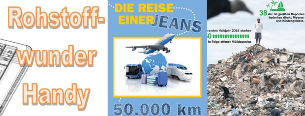 u.a. „Rohstoffwunder Handy“, „Die Reise einer Jeans“, „Unser alltäglicher Müll“, „Komm mit nach Afrika!“