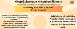 23.04.2026: Gesprächsrunde Krisenbewältigung - Verständnis des Kollaps und des Auseinanderfallens in verschiedenen ökologischen und gesellschaftlichen Bereichen.